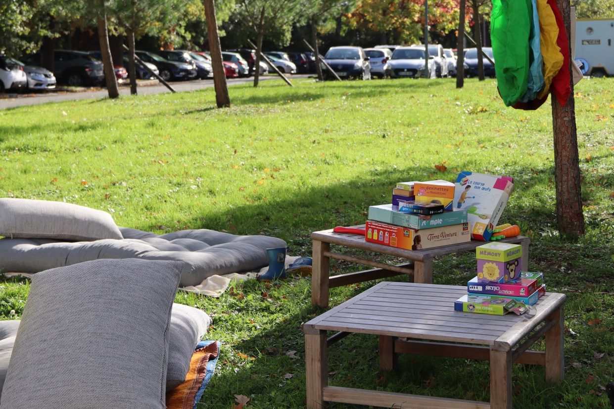 Et pour les petits qui ne veulent pas se lancer dans les recherche, un espace jeu et détente, sous un soleil timide 🙂